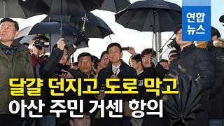 19 달걀 던지고 도로에 눕고…아산 주민들, 행안부 장관에 항의 / 연합뉴스 (Yonhapnews)
